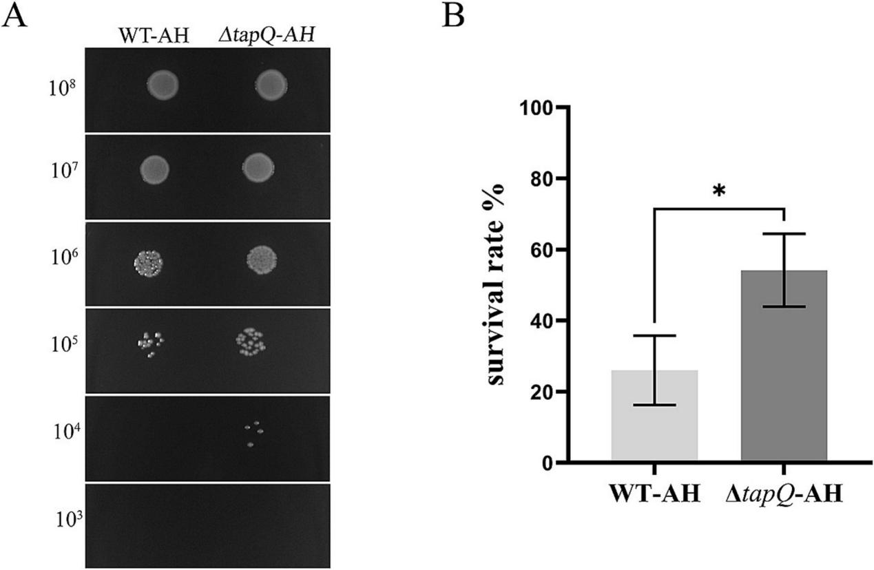 图1 WT-AH和ΔtapQ-AH的抗逆性比较。 (A)氧化应激抗性试验结果 (B)高渗耐受性试验结果
