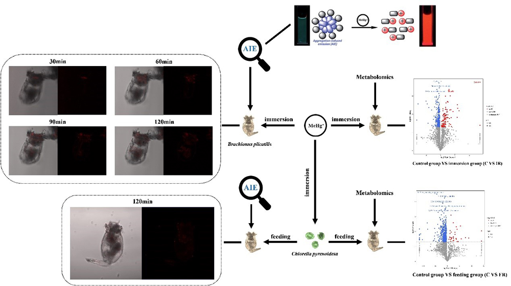 课题组与澳大利亚弗林德斯大学秦建光教授实验室,就利用AIEgen(聚集诱导发光材料)和荧光图像分析方法可视化甲基汞在浮游动物(轮虫、枝角类等)体内的吸收释放水平及富集代谢规律开展了多年的持续合作研究,产出了多项有价值的成果。相关成果曾陆续发表在Environmental Science: Nano, 2017;Chemistry - An Asian Journal, 2019;Ecotoxicology and Environmental Safety, 2022等国际著名期刊;2023年5月还被编入国家出版基金项目“聚集诱导发光丛书”:《聚集诱导发光之环境科学》。课题组将继续深入研究汞元素在浮游动物、底栖动物和鱼类体内的富集与代谢特征,力争完善汞元素在整个水生食物链上的富集代谢规律。