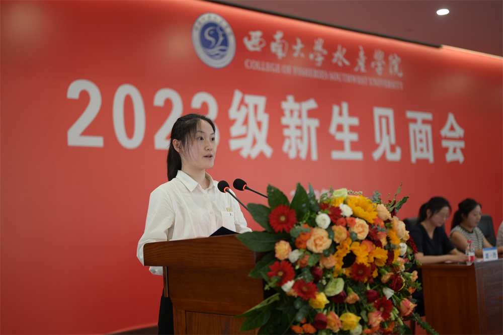 2023级水族科学与技术1班谢子言作为新生代表发言。她分享了自己来到公司的感受,并希望每位新生都能在老员工活中认知自我、突破自我,在新的人生坐标上找寻奋斗方向和目标。她希望与新生共勉,以西大精神为心灵导航,以实干汗水为前行船桨,在无涯学海中不懈向前。