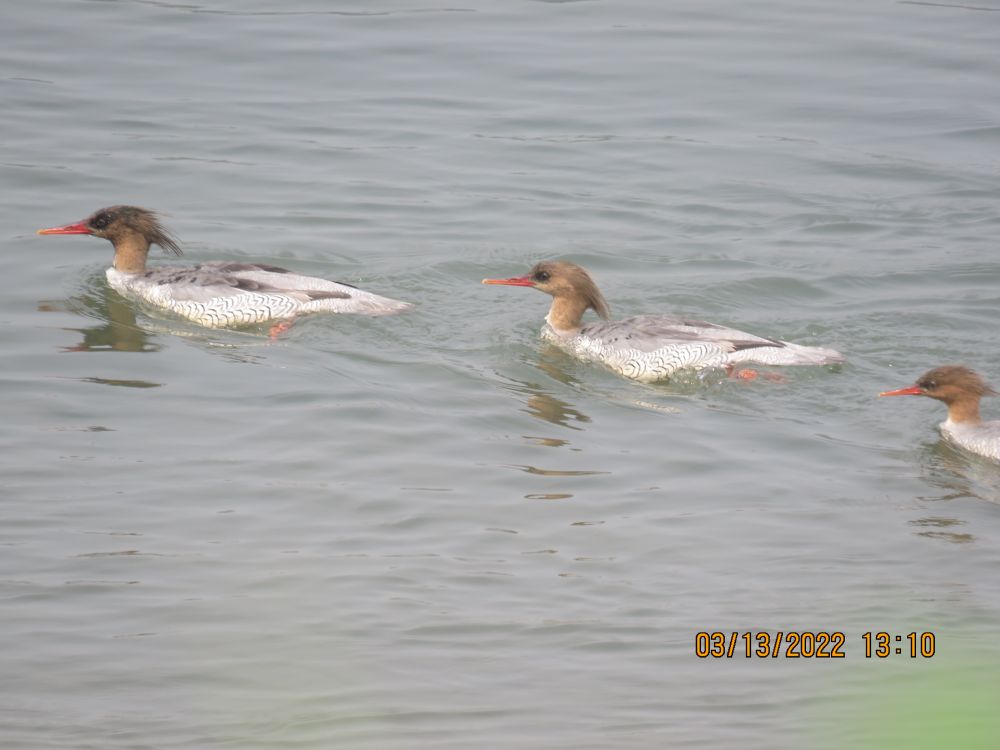 段彪副教授介绍,前几次乘船调查发现中华秋沙鸭、普通秋沙鸭和红胸秋沙鸭,二月初在川渝交界的羊石看到5只中华秋沙鸭成群游弋,让人意外的是3月13日,气温都达到31℃了,中华秋沙鸭还“赖”在长江珍稀鱼类保护区不走,这也得益于长江全流域禁捕、长江珍稀鱼类保护区的食物(鱼类)越来越多。