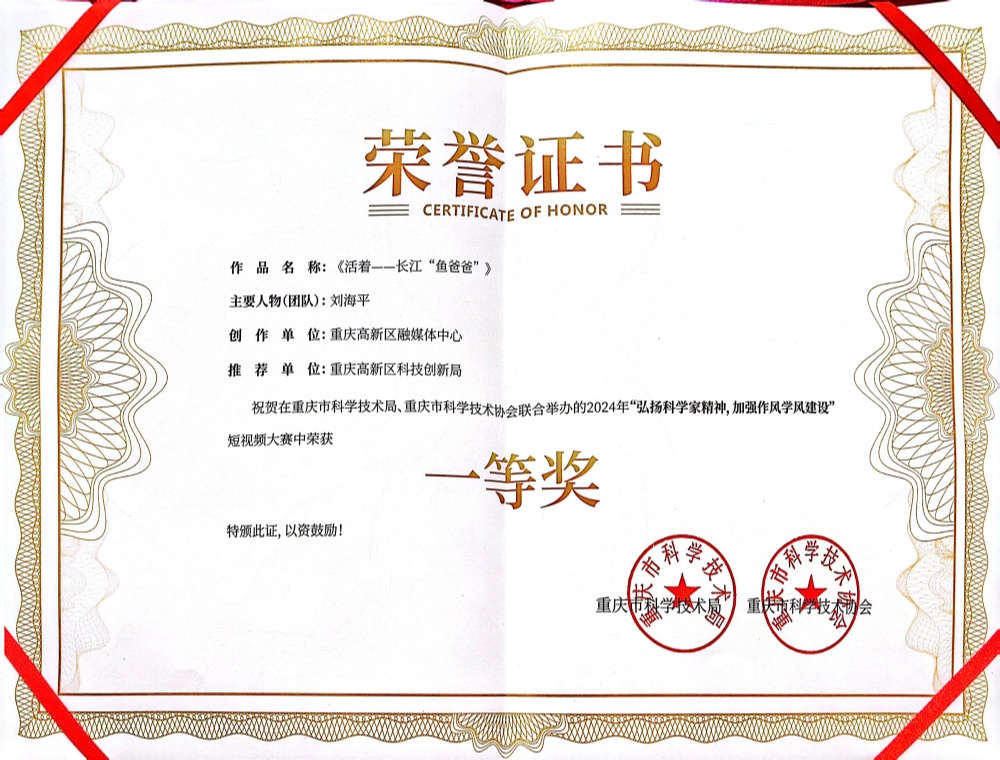 12月19日,由重庆市科学技术局、重庆市科学技术协会主办的“弘扬科学家精神,加强作风学风建设”短视频大赛颁奖典礼成功举办,重庆高新区融媒体选报的304永利集团西部(重庆)科学城种质创制大科学中心刘海平教授团队的故事作品《活着—长江“鱼爸爸”》荣获一等奖。